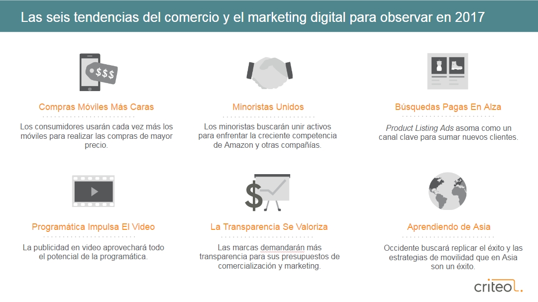 El que pasó ha sido otro gran año para el comercio digital, que alcanzó nuevos hitos como el aumento interanual del 50% en ventas móviles durante las compras del Black Friday, por sólo poner un ejemplo. Pero en este dinámico sector, siempre podemos esperar cambios significativos y en ese sentido, 2017 no será la excepción. Criteo puede detectar esos cambios y las nuevas tendencias en el comercio electrónico y el marketing digital, gracias al análisis permanente de las 15 millones de solicitudes por segundo que maneja su red de display.
