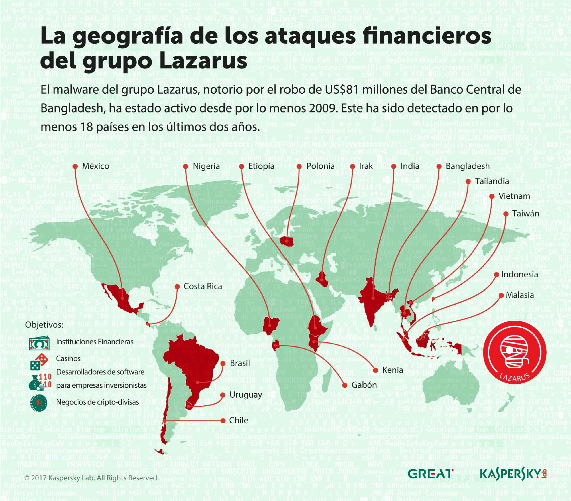 De acuerdo con los datos de Kaspersky Lab, desde diciembre de 2015, las muestras de malware relacionadas con la actividad del grupo Lazarus aparecieron en instituciones financieras, casinos, desarrolladores de software para compañías inversionistas y negocios de cripto divisas en Brasil, México, Chile, Costa Rica, Uruguay, Corea, Bangladesh, India, Vietnam, entre otros países. Las muestras más recientes conocidas por Kaspersky Lab fueron detectadas en marzo de 2017, lo que demuestra que los atacantes no tienen intención de detenerse.